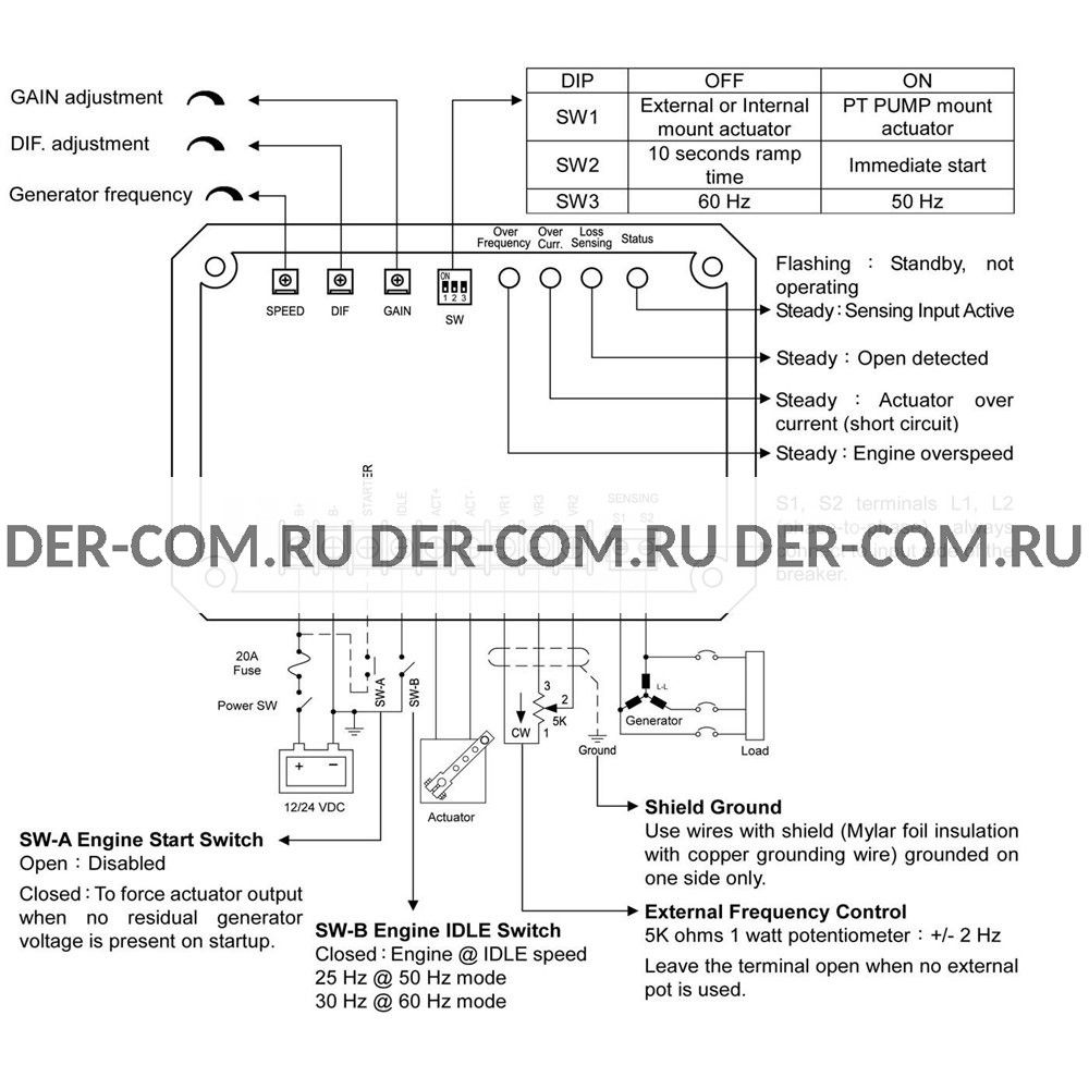 Регулятор оборотов EG-4015 не нуждается в магнитном датчике скорости. Регулятор оборотов EG4015 использует частоту выходного напряжения генератора для управления скоростью двигателя, поэтому магнитный датчик скорости не требуется.